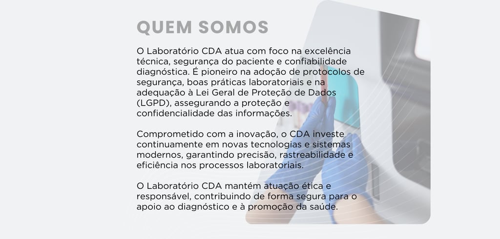 A marca do Laboratório CDA é o compromisso. Nos dedicamos diariamente para honrar o compromisso que fazemos para com a sociedade ao qual estamos inseridos, que é a qualidade do diagnóstico médico laboratorial. Esse compromisso é de suma importância, pois é com a vida de nossos pacientes. Para tal, cumprimos todas as obrigações legais, sociais e técnicas para garantir sempre qualidade em tudo o que fazemos.